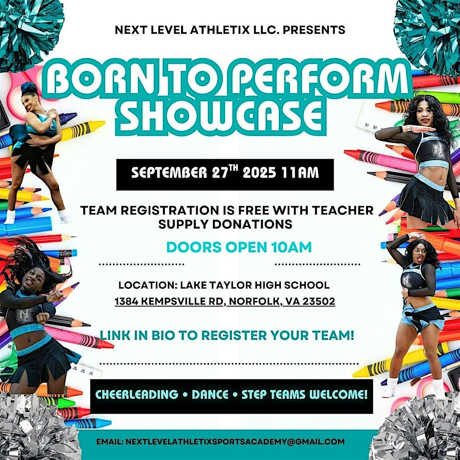Born To Perform is a high-energy cheer, dance, and step event where teams come together to perform! On site Teacher supply drive!